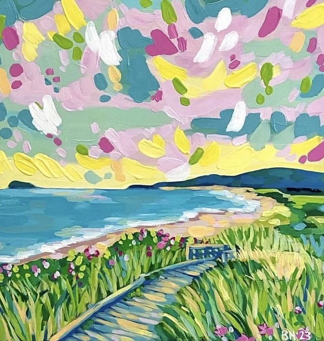 Baddeck Lighthouse (2023). Acrylic on cradled board, 14x14". Inverness Beach (2023). Acrylic on cradled board, 14x14".